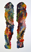 “O My Goodness,” 2010, is a painting on masonite that sequentially cycles through a Janson’s-style history of world religions through art, starting with a scratchy, black, cosmic void that morphs into a cave painting. From there, Clough incrementally grinds down the image and overlays it with his characteristic expressionistic abstractions before painting another iconic image.