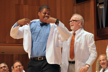 Trevor York receives his coat from endocrinologist Richard Berkson, MD ’72. Photo: SANDY KICMAN