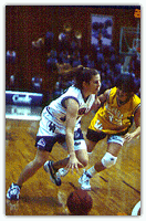 Royals and Bulls faced Valparaiso Saturday in Alumni Arena before the enthusiastic support of the UB Pep Band, center. Left, UB's Brenna Doty drives past Valparaiso guard Megan New-comer as Royals post 69-49 win. Right, Bulls guard Mike Martinho squeezes past Valparaiso's Bill Jenkins as Bulls come up inches short, losing 64-62. | ||