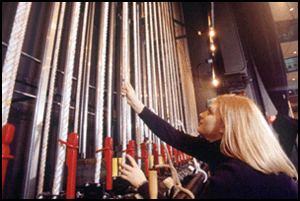 Stephanie Manka, 19, a sophomore theatre-and-dance major, sets up counterbalances for stage lighting in the Drama Theatre in the Center for the Arts. Students reconfigured the lighting to its usual layout following a recent performance.