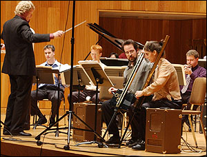 HISTORIC MOMENT. Magnus Mårtensson (left) conducts the Slee Sinfonietta on Tuesday as Jonathan Golove and Mary Artmann play theremin cellos during the first performance of Edgard Varese's "Ecuatorial" with its intended instrumentation of two theremin cellos, baritone voice and orchestra since the piece's premiere in 1934. (Photo: Nancy J. Parisi)