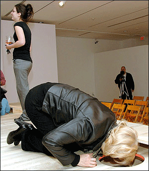DOWN THE RABBIT HOLE. No, It's not Alice, just an interested gallery visitor taking a peek at "Scene from Olympus Manger," an exhibit by artist Kelly Kaczynski on view in the UB Art Gallery in the Center for the Arts through May 13. (Photo: Nancy J. Parisi)