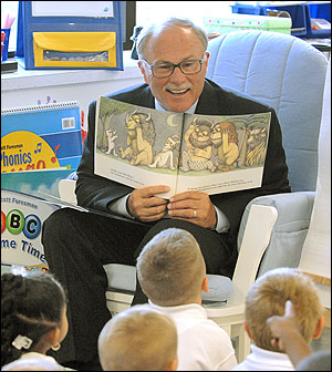 STORY TIME. President John B. Simpson reads Maurice Sendak's "Where the Wild Things Are" to first graders at the Charter School for Applied Technologies as the first in a series of "celebrity" readers for the school's Celebration of Reading Week. (Photo: Nancy J. Parisi)