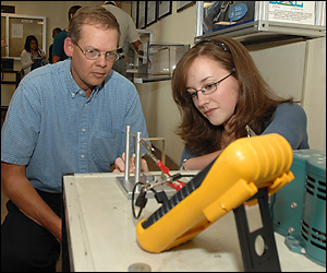 ART EXAMINES PRINCIPLES OF PHYSICS. Megan Baker, a student at Lockport High School, explains her magnetic heat engine to Dave Rechin, an engineering manager at Sefar Filtration in Depew, during a presentation on Aug. 11 of projects constructed by high school students participating in UBs Physics and Arts Summer Institute. Click here to read a story about the institute. (Photo: Nancy J. Parisi)